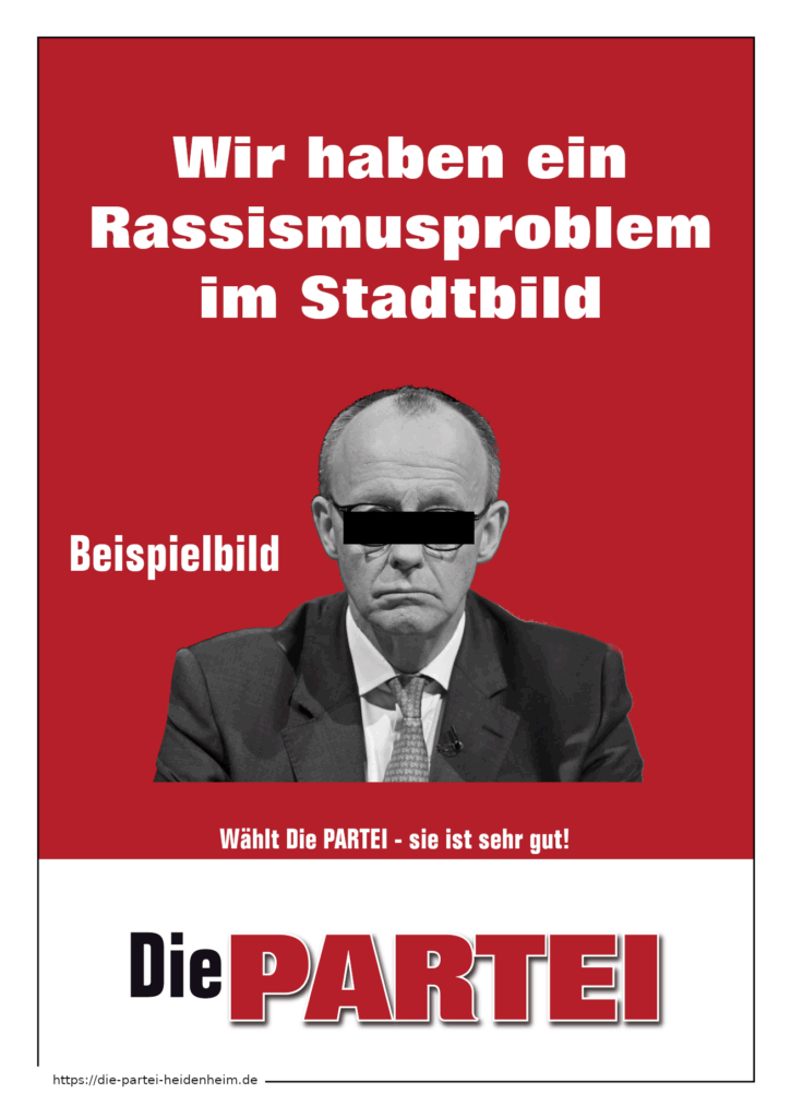 Während Friedrich Merz munter daran arbeitet, das Stadtbild Deutschlandweit in ein Bühnenbild für seine persönlichkeitsgestörte Stadlshow zu verwandeln, fragen wir uns besorgt: Was sagt eigentlich die örtliche CDU in Heidenheim zu dieser neuen Folge namens „Merz gegen die Wirklichkeit“?