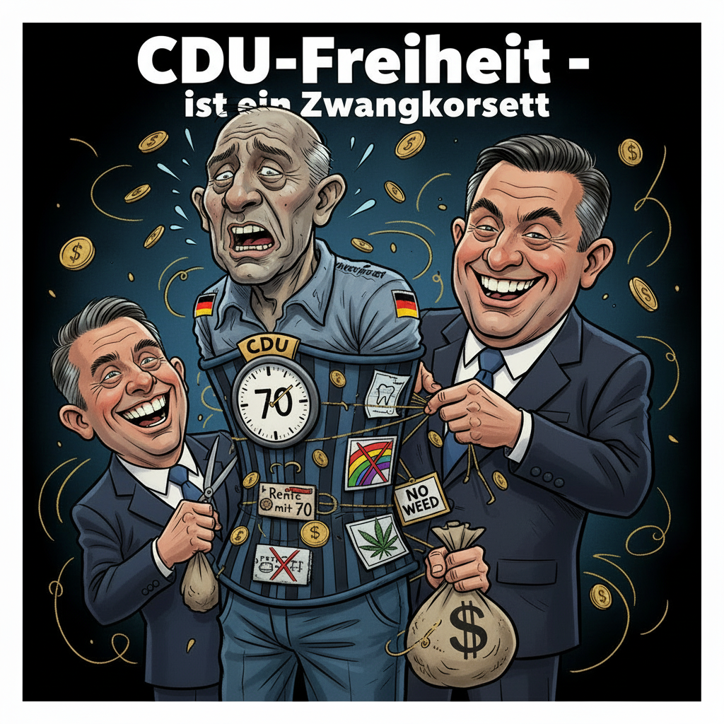 Die CDU-Freiheit: Kaviar für Reiche, Leitkultur für alle anderen Die CDU-Freiheit ist ein exklusives Gut für Eliten – für Geldsäcke mit Rendite ohne Regeln. Für die breite Masse bleibt die Leitkultur-Agenda: Deutsch sprechen, Ehrenamt leisten, länger arbeiten und traditionell lieben. Der „perfekte Merz-Bürger“ ist ein pflichtbewusster Rädchen-Dreher ohne Murren. Individualismus? Nur im Prospekt – solange er die Profite der Reichen nicht gefährdet. In Krisenzeiten wirkt diese Blaupause wie Rettungspaket – doch der Preis ist eine Gesellschaft, wo Gleichheit nur noch in Bilanzen existiert.